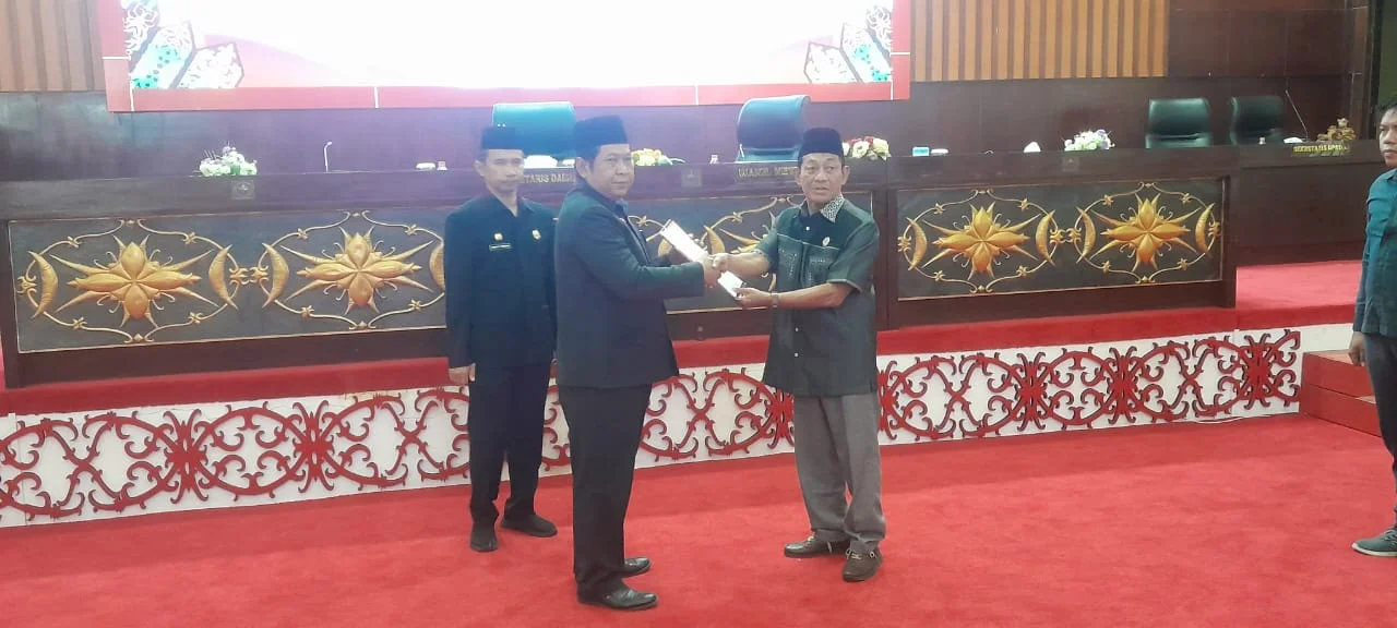 Pj. Sekda Mura Rudi Roy menyerahkan naskah Raperda kepada Wakil Ketua DPRD Mura Likon